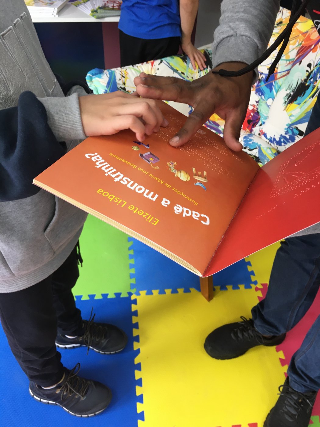 Os alunos assistiram a uma contação de história e depois puderam conhecer todos os títulos dos livros que compõem a estante literária.