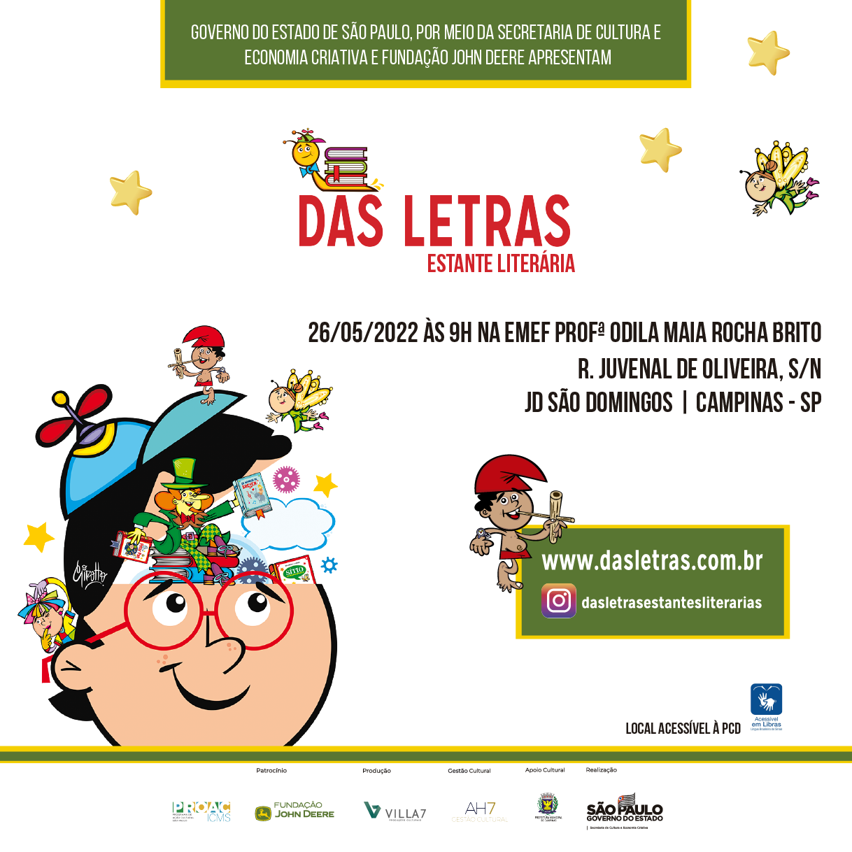 Viabilizado pelo Governo do Estado de São Paulo, por meio da Lei de Incentivo do Programa de Ação Cultural (ProAC), da Secretaria de Cultura e Economia Criativa, o Das Letras – Estante Literária é produzido pela Villa 7 Produções Culturais em parceria com a AH7 Gestão Cultural. Em Campinas, a ação é patrocinada pela Fundação John Deere e tem apoio da Prefeitura.