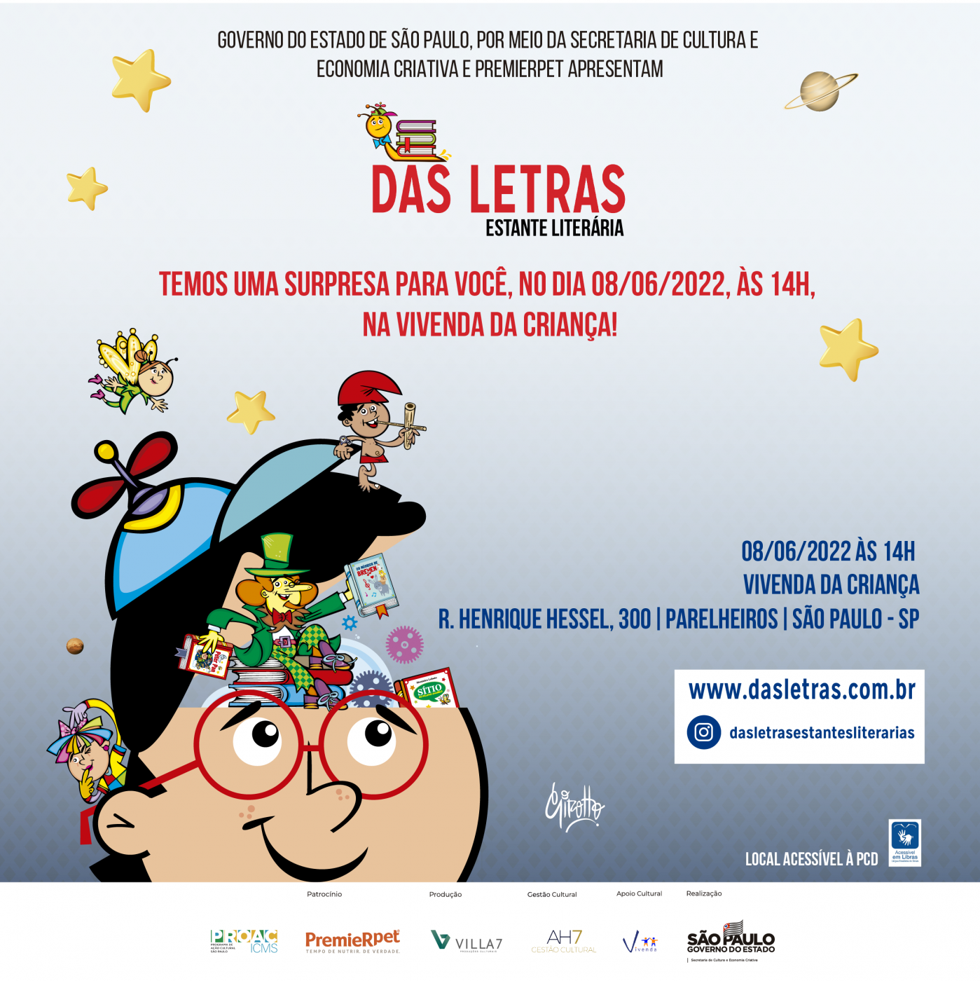 Viabilizado pelo Governo do Estado de São Paulo, por meio da Lei de Incentivo do Programa de Ação Cultural (ProAC), da Secretaria de Cultura e Economia Criativa, o Das Letras – Estante Literária é produzido pela Villa 7 Produções Culturais em parceria com a AH7 Gestão Cultural e recebe o patrocínio da empresa PremieRpet®.