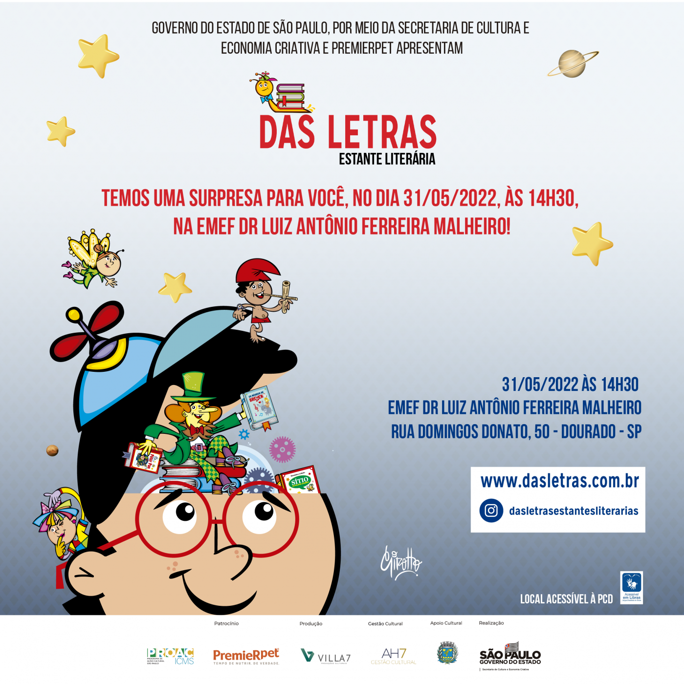 Viabilizado pelo Governo do Estado de São Paulo, por meio da Lei de Incentivo do Programa de Ação Cultural (ProAC), da Secretaria de Cultura e Economia Criativa, o Das Letras – Estante Literária é produzido pela Villa 7 Produções Culturais em parceria com a AH7 Gestão Cultural, e recebe o patrocínio da empresa PremieRpet® e o apoio da Prefeitura de Dourado, através Departamento Municipal de Educação.