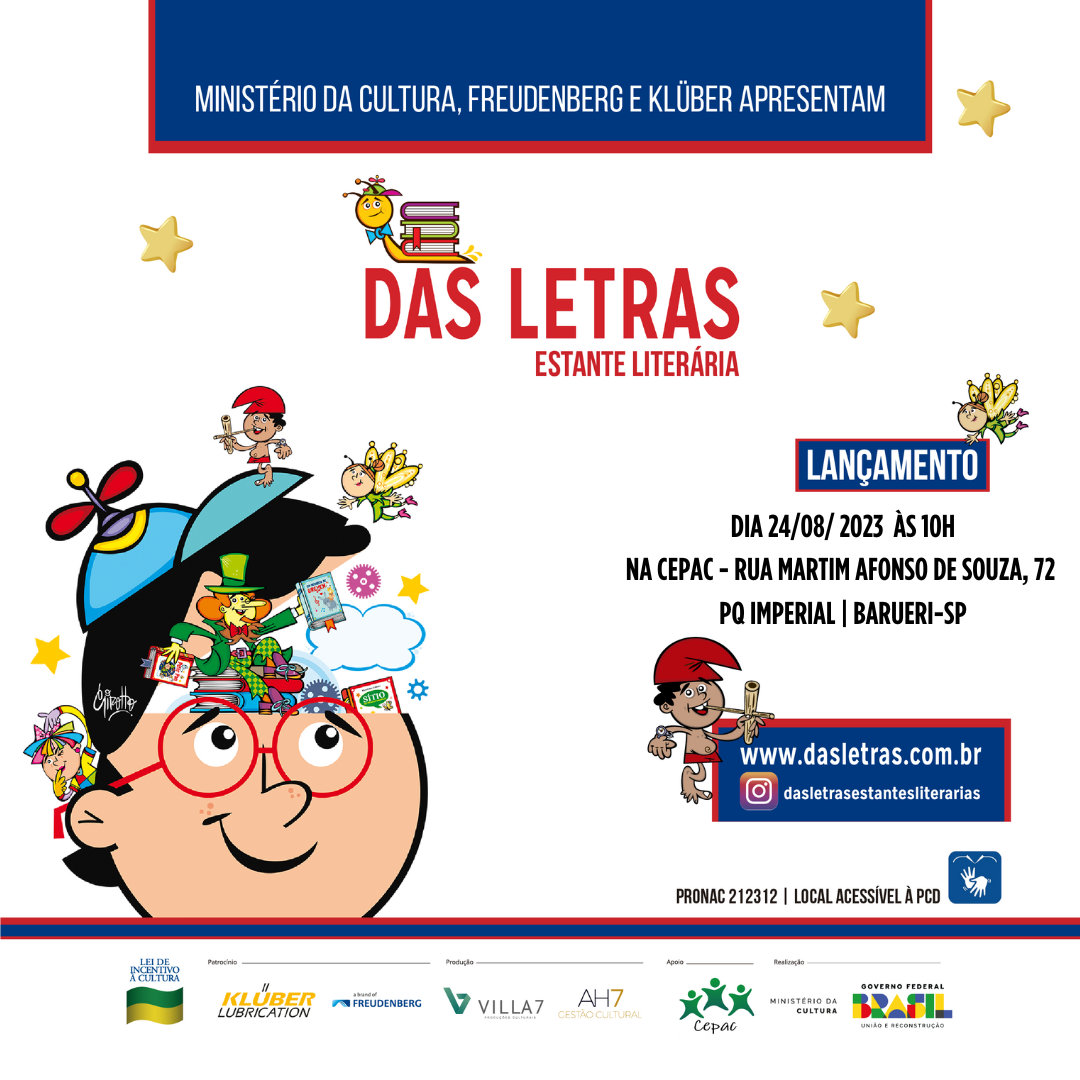 Com acessibilidade física, auditiva e visual, o evento tem classificação livre. Viabilizado pela Lei de Incentivo à Cultura com realização do Ministério da Cultura, ‘Das Letras - Estantes Literárias’ é produzido pela Villa 7 Produções Culturais em parceria com a AH7 Gestão Cultural.