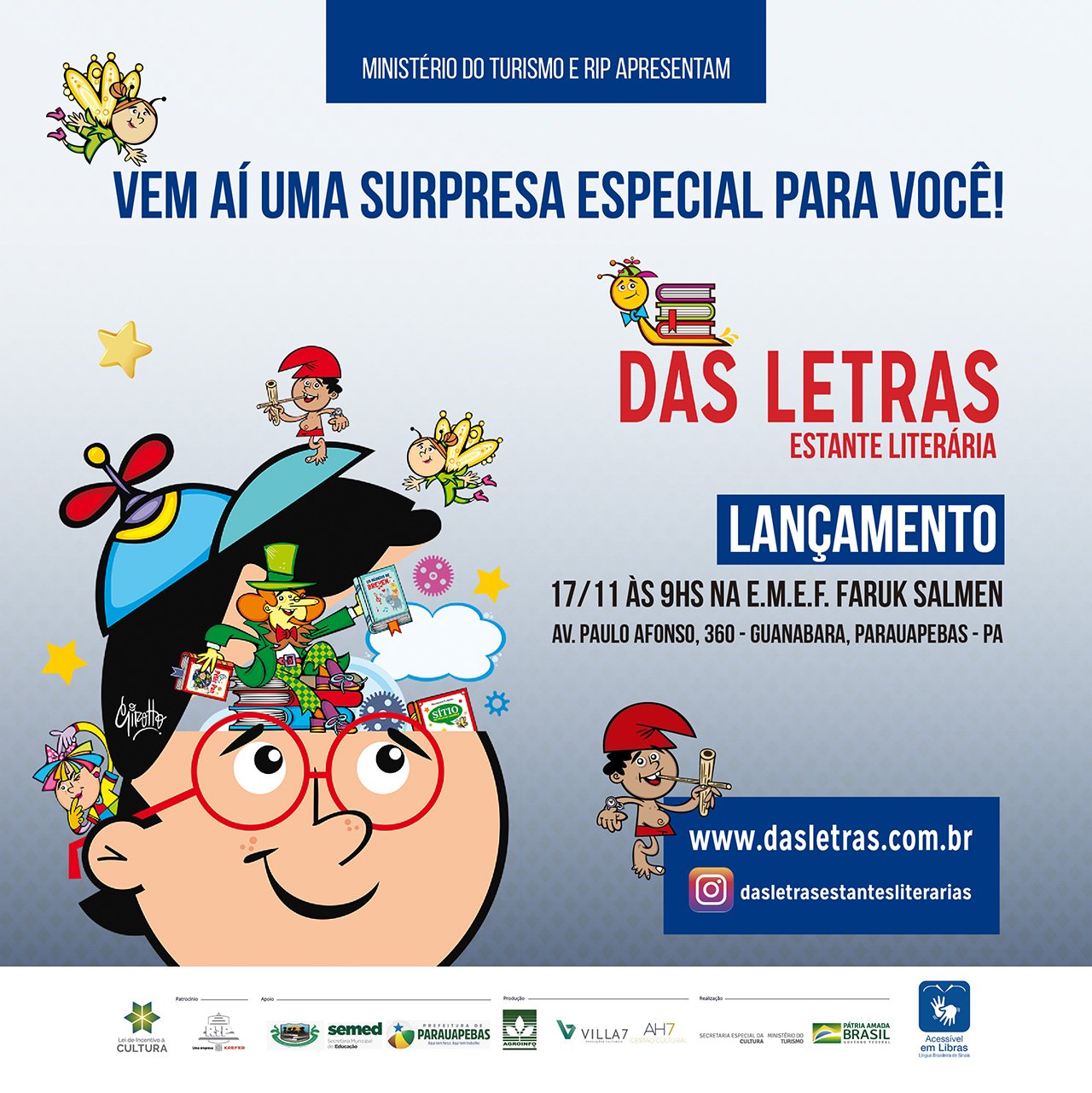 Viabilizado pela Lei de Incentivo à Cultura com realização do Ministério do Turismo (através da Secretaria Especial de Cultura), “Das Letras – Estantes Literárias” é produzido pelas empresas AGROINFO, Villa 7 Produções Culturais e AH7 Gestão Cultural. Em Parauapebas, a ação é patrocinada pela RIP Serviços Industriais.